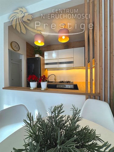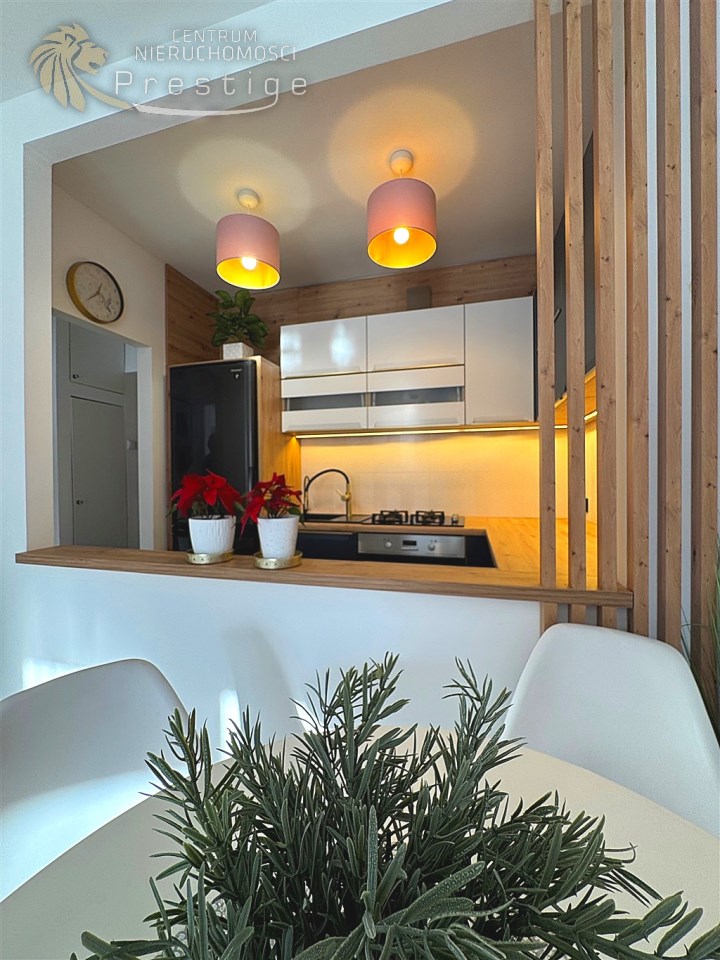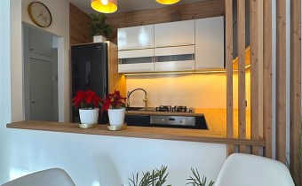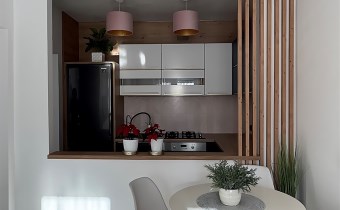 - Oddzielna kuchnia z dekoracyjnym otworem w ścianie łączącym ją z salonem, taki architektoniczny detal, który pozwala na swobodny przepływ światła i wizualną lekkość, przy zachowaniu wyraźnego podziału funkcji dodaje pomieszczeniom nowoczesnego charakteru