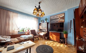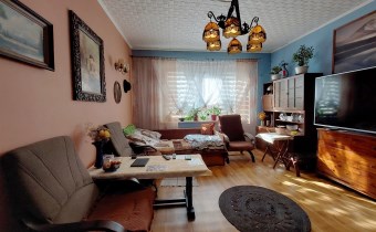 Salon bardzo duży i słoneczny emanuje spokojem i ciepłem. Przez szerokie okna wpadają promienie słońca, które świetnie naświetlają pomieszczenie naturalnym światłem. Całość jest niezwykle czysta i uporządkowana. Żaden kurz nie zalega, podłoga lśni, a firanki są świeżo wyprane i lekko poruszają się na wietrze. W tym salonie czuć historię i serce ludzi, którzy go tworzyli – prostotę, spokój i domowe ciepło.