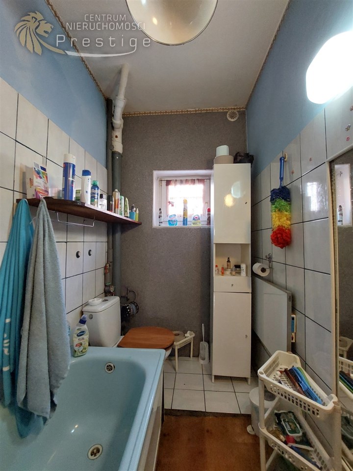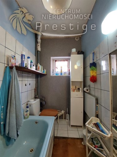 * Łazienka nosi ślady dawnych czasów – to przestrzeń, która pamięta remont sprzed wielu lat. Ściany pokrywa klasyczna glazura w odcieniach bieli, gdzieniegdzie z lekkim połyskiem, który z biegiem lat przygasł. Armatura, choć w pełni sprawna, ma już swój wiek – kran i bateria przy wannie nie błyszczą jak nowe, ale nadal dobrze spełniają swoją funkcję. Podłogę pokrywają płytki o wzorze typowym dla minionych dekad, solidne, choć z delikatnymi śladami zużycia. Oświetlenie jest proste dające ciepłe światło. Całość nie wpisuje się już w obecne standardy nowoczesnego designu, nie ma modnych detali ani energooszczędnych rozwiązań, ale pomimo tego łazienka pozostaje funkcjonalna , wciąż jest praktyczna i w pełni użytkowa.