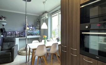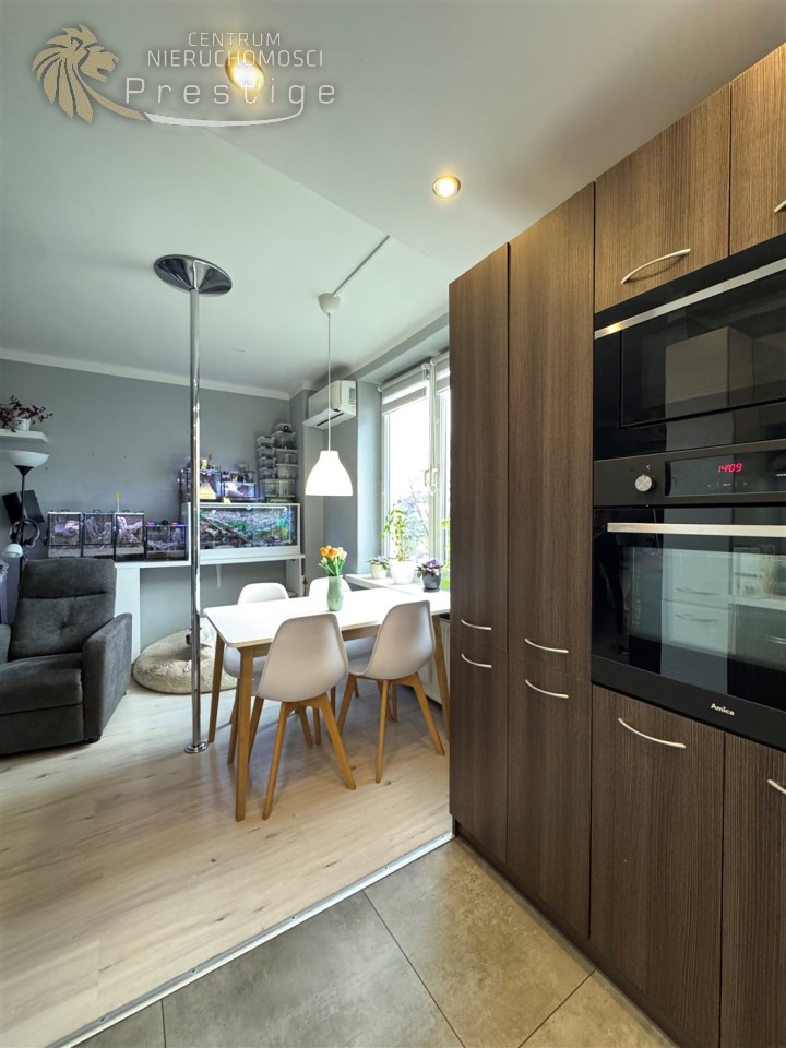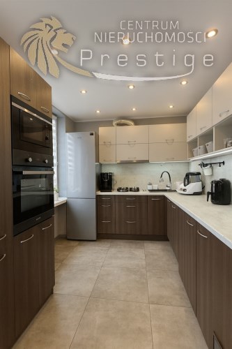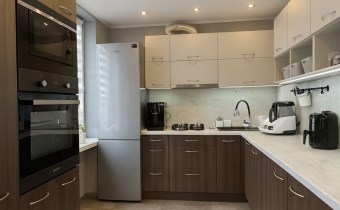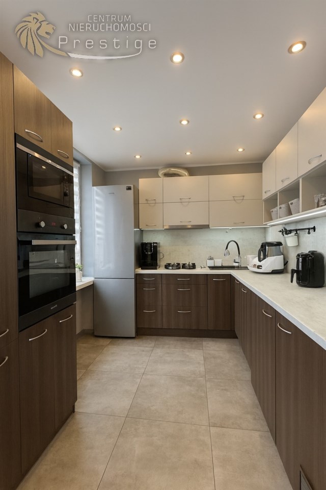 – dużej, widnej kuchni z zabudową wykonaną na zamówienie, wyposażoną w wysokiej klasy sprzęt AGD (lodówka, zmywarka, piekarnik, mikrofalówka, płyta gazowa). To duża oszczędność — cały ten zestaw pozostaje w cenie mieszkania. Istnieje możliwość przywrócenia pierwotnego układu z odrębną kuchnią.