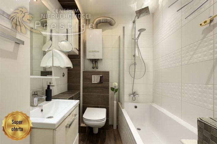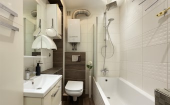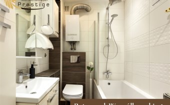 – łazienki z wc, komfortowej, umeblowanej i wyposażonej w wannę, a także elektryczną suszarkę do rąk, która pozostaje na wyposażeniu.