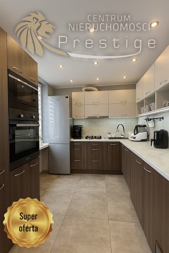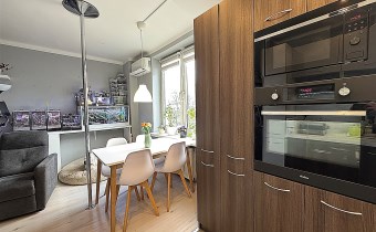 – dużej, widnej kuchni z zabudową wykonaną na zamówienie, wyposażoną w wysokiej klasy sprzęt AGD (lodówka, zmywarka, piekarnik, mikrofalówka, płyta gazowa). To duża oszczędność — cały ten zestaw pozostaje w cenie mieszkania. Istnieje możliwość przywrócenia pierwotnego układu z odrębną kuchnią.