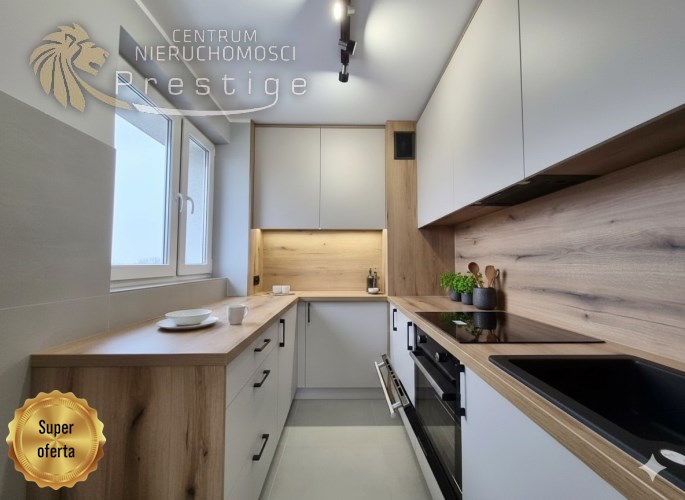 Wnętrze utrzymane jest w eleganckiej kolorystyce kaszmiru i naturalnych odcieni drewna. Wszystkie zabudowy wykonano na wymiar, dzięki czemu przestrzeń jest funkcjonalna i bardzo estetyczna. Mieszkanie jest gotowe do wprowadzenia bez dodatkowych nakładów.