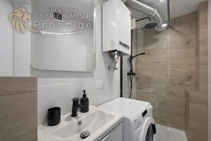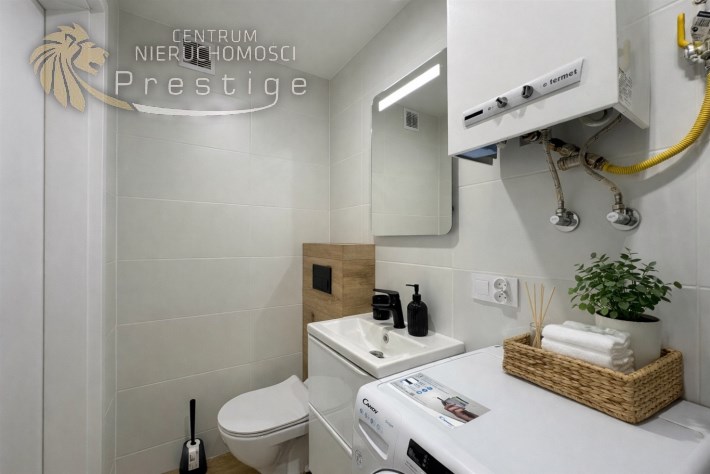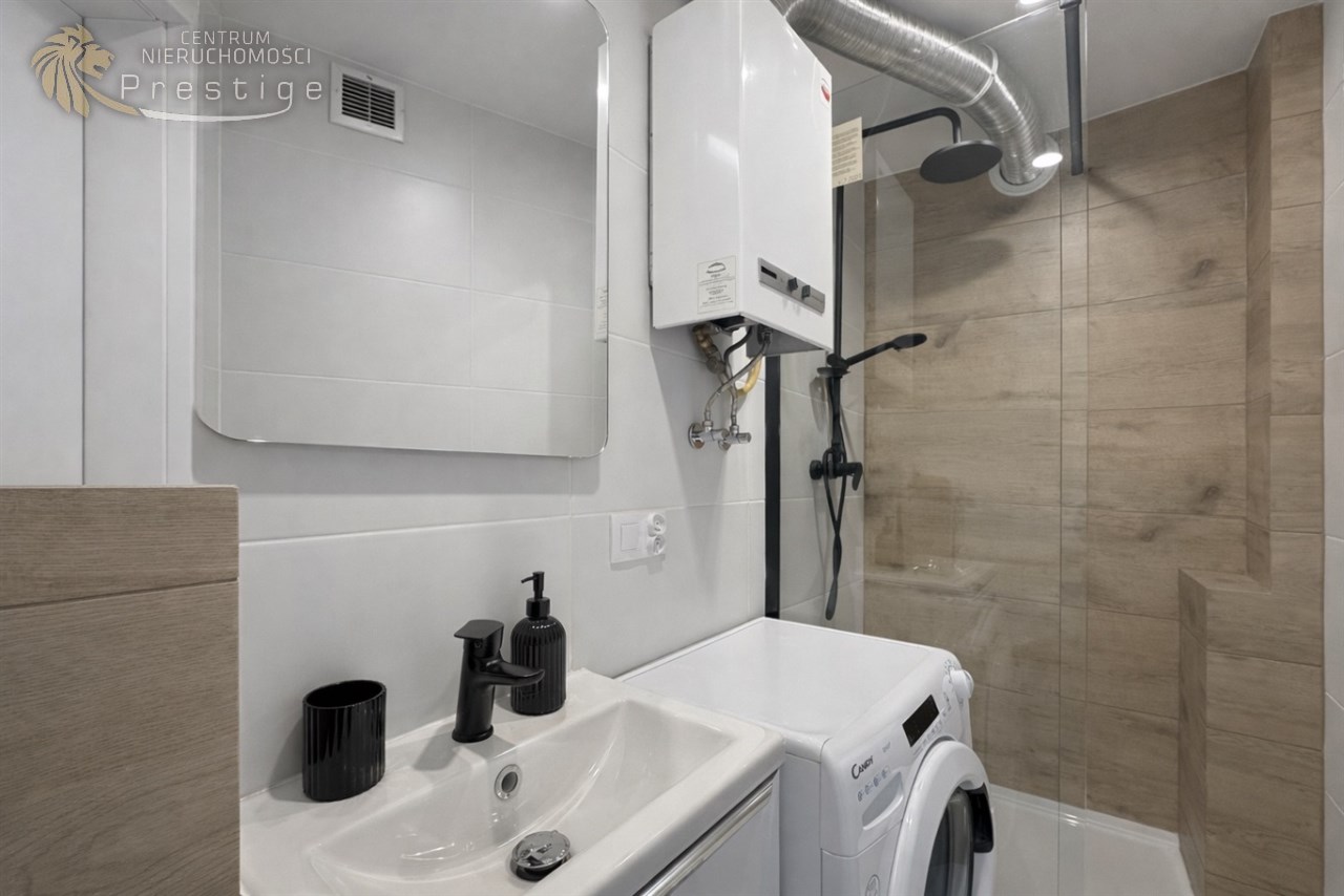 Łazienka jest w pełni wykafelkowana i wyposażona w prysznic oraz pralkę. Zamontowano drzwi antywłamaniowe. Kuchnia z oknem została wyposażona w lodówkę. Szafka RTV, telewizor oraz sofa stanowi jedynie wirtualny home staging. Reszta umeblowania widoczna na zdjęciu pozostaje w cenie mieszkania. Ogrzewanie pochodzi z sieci miejskiej, natomiast ciepła woda z pieca jednofunkcyjnego.