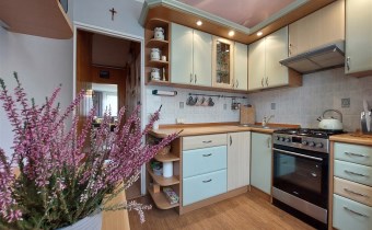 * KUCHNIA - zabudowa jest utrzymana w bardzo dobrym stanie technicznym – widać na niej upływ czasu i naturalne ślady użytkowania, jednak dzięki solidnemu wykonaniu i regularnej pielęgnacji może z powodzeniem służyć jeszcze przez wiele lat. Sprzęty AGD są w pełni sprawne, a całość prezentuje się schludnie i przytulnie. Kuchnia została zaprojektowana w sposób funkcjonalny i praktyczny – posiada liczne szafki do przechowywania, duży blat roboczy oraz miejsce na stół ( aktualnie boczna wyspa), przy którym można zjeść rodzinne śniadanie czy napić się kawy. To pomieszczenie, w którym od razu czuć domową atmosferę – idealne miejsce dla osób, które lubią gotować i spędzać czas w ciepłym, rodzinnym wnętrzu.
