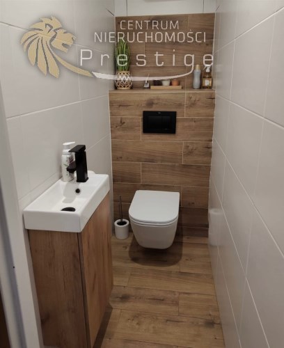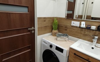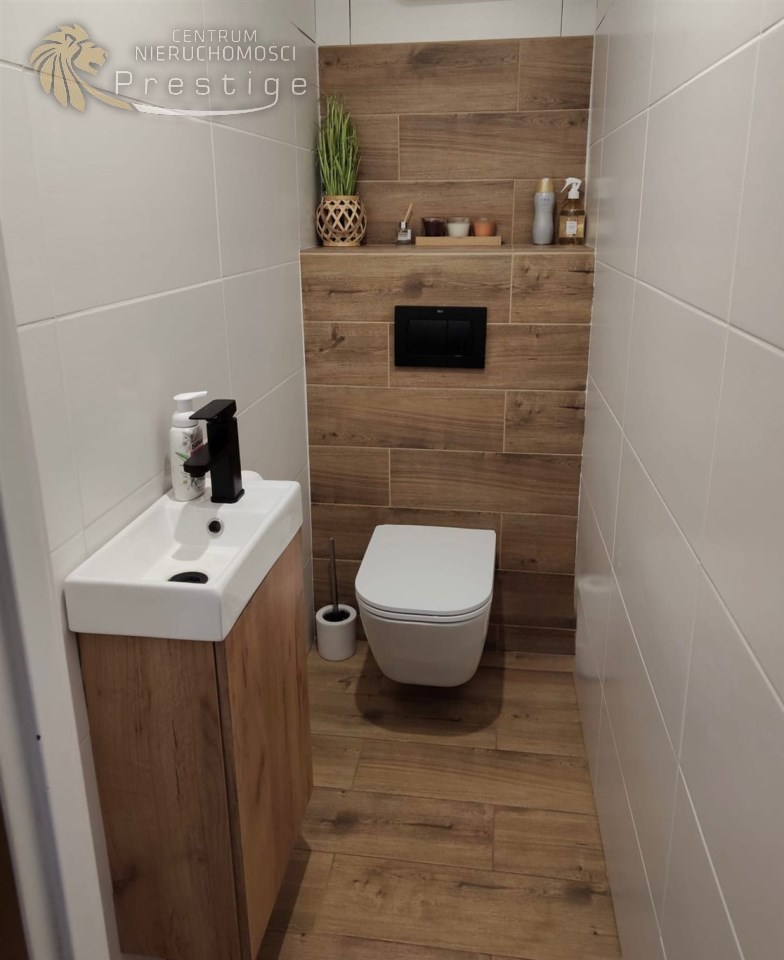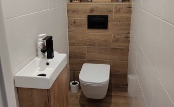 * Osobne WC - zostało urządzone w eleganckim stylu, spójnym z charakterem łazienki. Dominują tu biel i drewno, tworzące wrażenie czystości i nowoczesnej prostoty. Jasne ściany optycznie powiększają przestrzeń, a drewniane akcenty dodają jej ciepła i przytulności. Nie zabrakło również miejsca na poręczną, niewielką umywalkę umieszczona na zgrabnej szafce, która zapewnia dodatkowe miejsce do przechowywania drobiazgów. Całość dopełnia czarna armatura, stanowiąca elegancki kontrast dla jasnych tonów wnętrza i nadająca mu wyrazistego klimatu. To małe, ale bardzo funkcjonalne pomieszczenie, w którym każdy detal został przemyślany tak, by połączyć estetykę z wygodą.