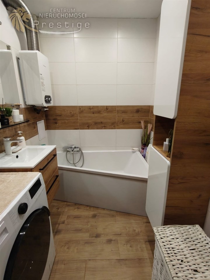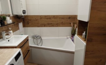 * Łazienka - dominuje w niej połączenie bieli i drewna, które tworzy atmosferę czystości, harmonii i naturalnego ciepła. Jasne płytki subtelnie odbijają światło, dzięki czemu wnętrze wydaje się jeszcze większe i bardziej otwarte. W centralnej części pomieszczenia znajduje się narożna wanna, która zaprasza do chwili relaksu po długim dniu. To miejsce, w którym można naprawdę odpocząć — w ciepłej kąpieli, przy delikatnym świetle i zapachu ulubionych olejków.