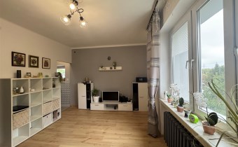 - duży dobrze doświetlony pokój, z widokiem na zieleń (brak sąsiadów zaglądających z naprzeciwka do okien) wyposażony w meble, sprzęt RTV, stolik kawowy oraz kanapę