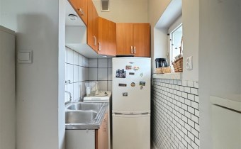 - mała widna kuchnia, wyposażona w meble, lodówkę, pralkę, dwupalnikową kuchenkę elektryczną.