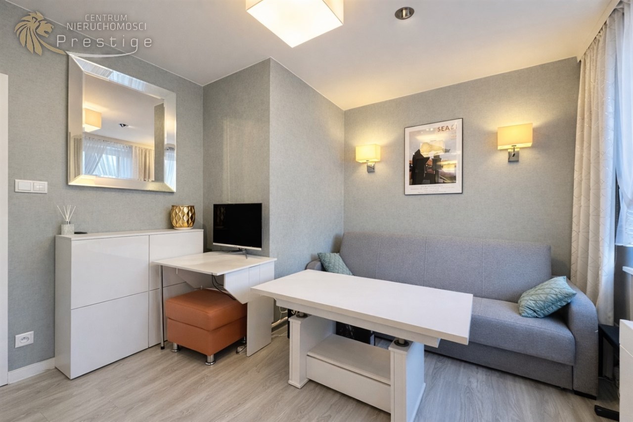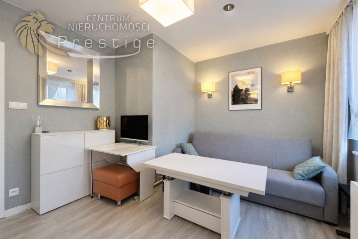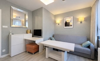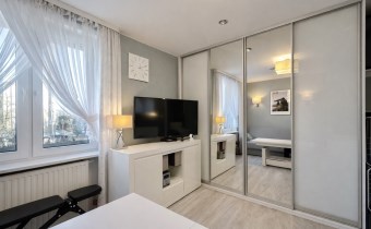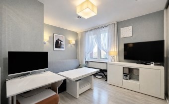 W strefie dziennej znajduje się sofa, stół jadalniany, duży telewizor oraz pojemna szafa przesuwna z lustrem. Do dyspozycji najemcy pozostają również żelazko, deska do prasowania, suszarka na pranie oraz drabina.