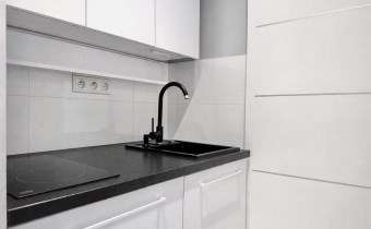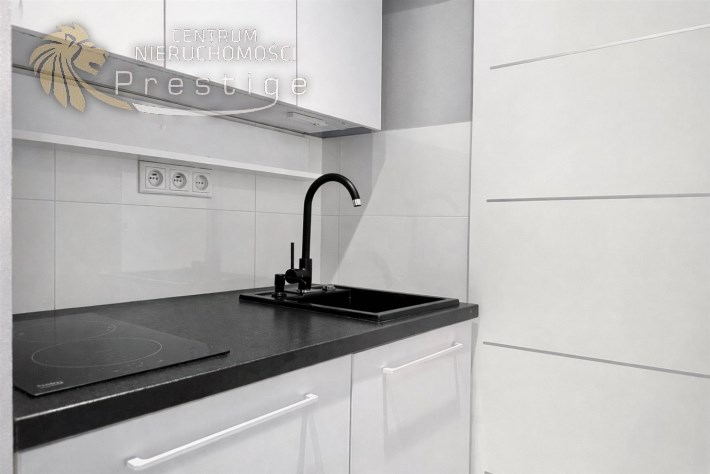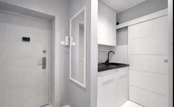 W mieszkaniu wydzielono strefę pracy zdalnej z biurkiem i krzesłem. Rozwiązanie to zapewnia komfort osobom pracującym z domu. Aneks kuchenny został ukryty we wnęce i wyposażony w płytę indukcyjną, lodówkę, czajnik oraz pełną zastawę kuchenną.
