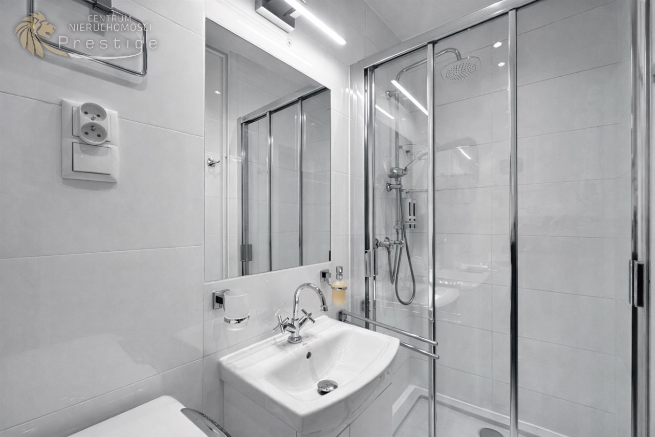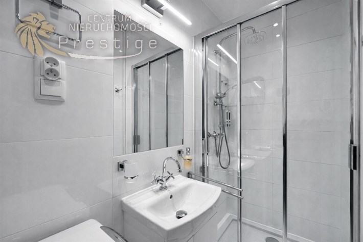 Łazienka wykończona jest w nowoczesnym stylu i wyposażona w kabinę prysznicową, pralkę ładowaną od góry oraz płaski bojler marki Ariston z funkcją ECO.