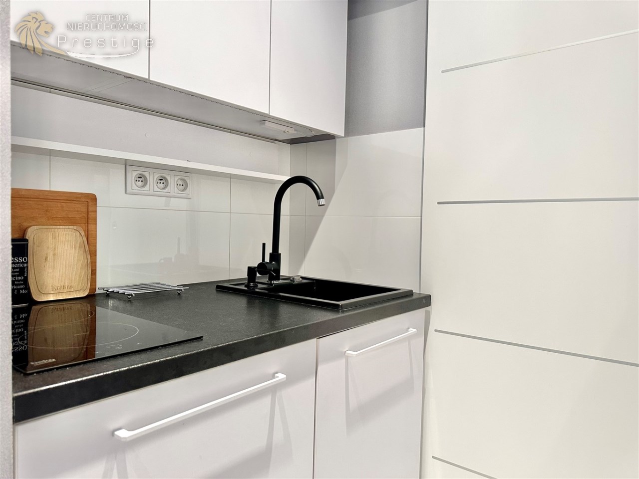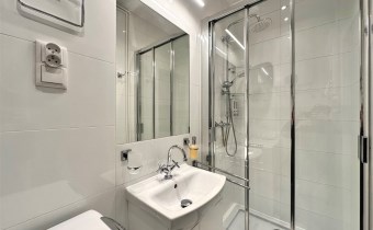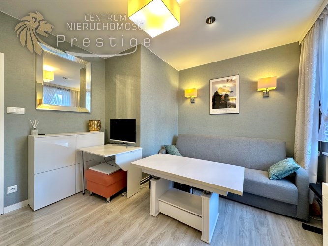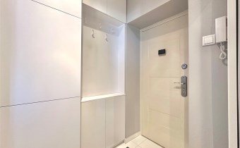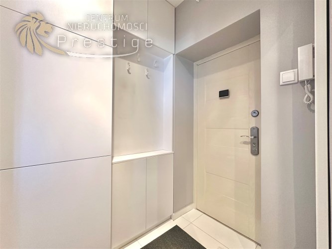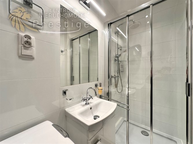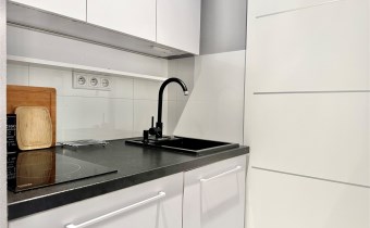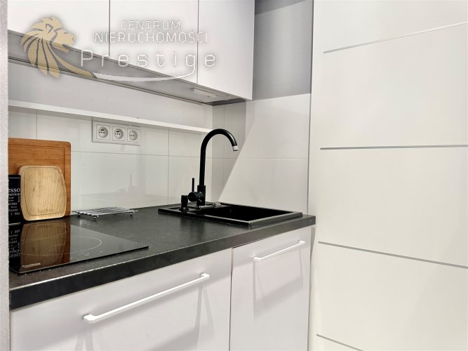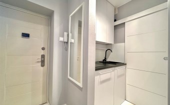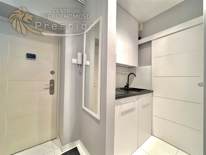 W mieszkaniu wydzielono komfortową strefę pracy zdalnej z biurkiem i krzesłem, co stanowi rzadko spotykane rozwiązanie w kawalerkach i idealnie sprawdzi się dla osób pracujących zdalnie. Aneks kuchenny został dyskretnie ukryty we wnęce, dzięki czemu nie dominuje w przestrzeni mieszkalnej. Wyposażony jest w płytę indukcyjną, lodówkę, czajnik oraz pełną zastawę kuchenną. Łazienka została wykończona w nowoczesnym stylu i wyposażona w kabinę prysznicową, pralkę ładowaną od góry oraz nowoczesny, płaski bojler marki Ariston z funkcją ECO.