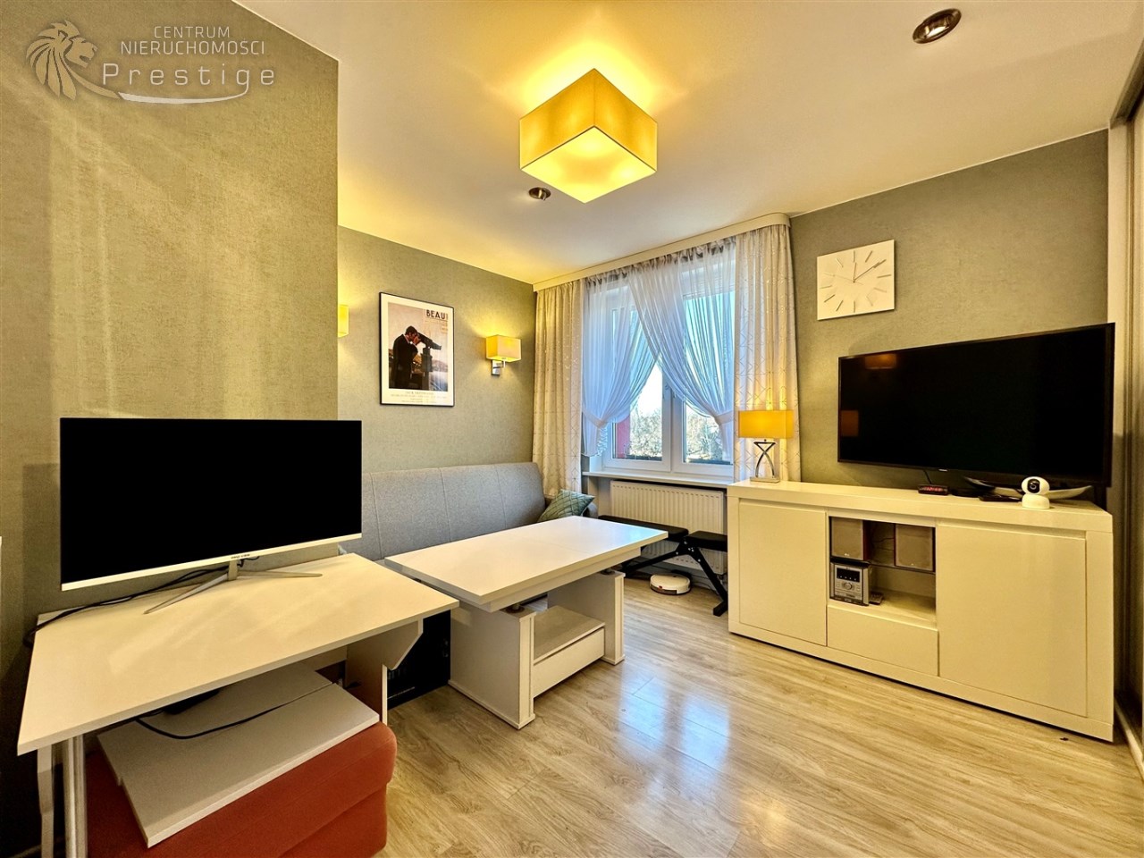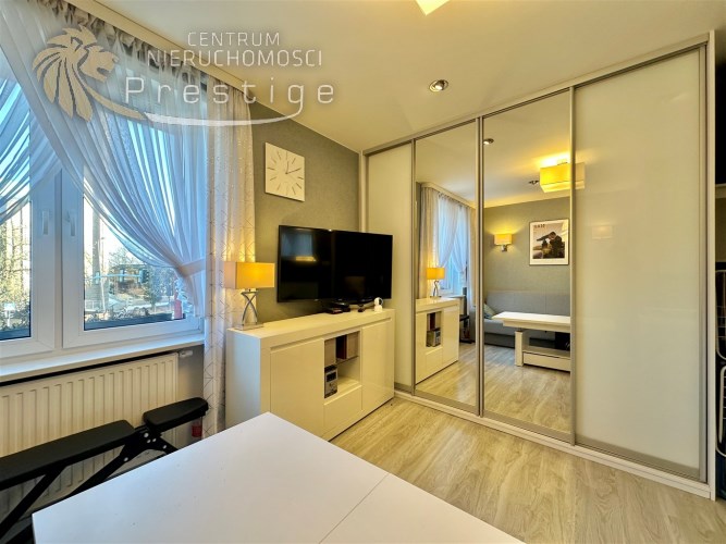 Lokal po generalnym remoncie. Został zaprojektowany z dbałością o funkcjonalność oraz wysoki standard wykończenia. Mieszkanie jest w pełni wyposażone i gotowe do zamieszkania od razu, bez konieczności ponoszenia dodatkowych nakładów. W strefie dziennej znajduje się wygodna sofa, stół jadalniany, duży telewizor oraz pojemna szafa przesuwna z lustrem, która optycznie powiększa przestrzeń. Do dyspozycji najemcy pozostają również żelazko, deska do prasowania, suszarka na pranie oraz drabina.