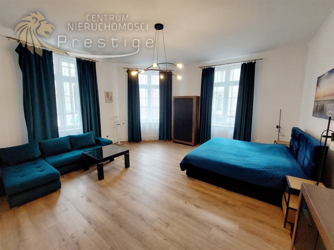 Duży, jasny i ustawny pokój stanowi serce lokalu. Znajduje się w nim komfortowe łóżko małżeńskie, idealne do wypoczynku, oraz przestronny narożnik tworzący przytulną strefę relaksu. W części wypoczynkowej wydzielono strefę TV, która zapewnia wygodne miejsce do spędzania wolnego czasu. Duże przeszklenia zapewniają niepowtarzalny klimat – poranne promienie słońca nadają wnętrzu energii, a wieczorne światło tworzy nastrojową, przytulną atmosferę. Pomieszczenie doskonale nadaje się zarówno do aranżacji jako aktualny salon z częścią wypoczynkową i jadalną, jak i przestrzeń do pracy czy prowadzenia usług, gdzie jasność i otwartość wnętrza mają ogromne znaczenie.